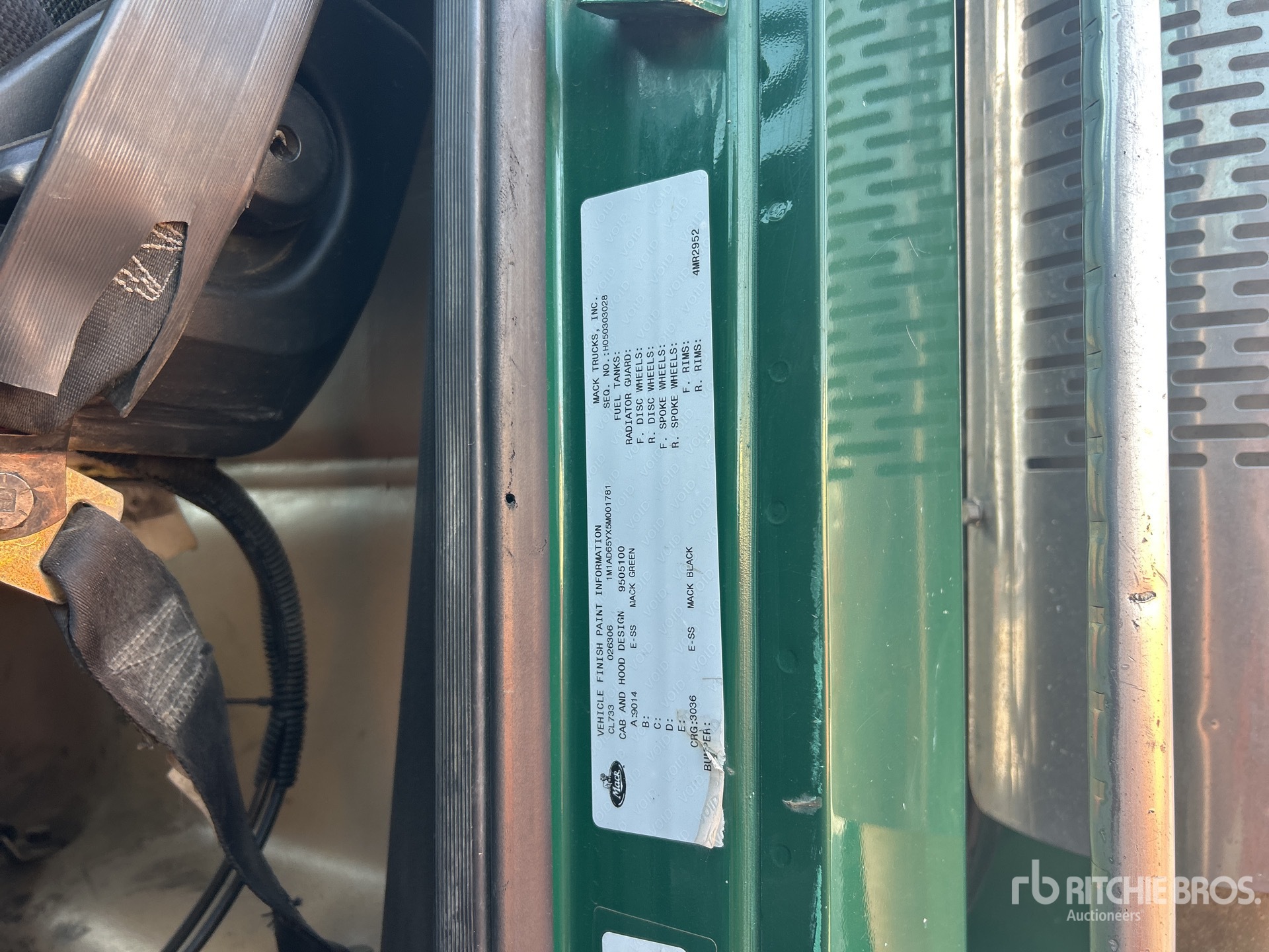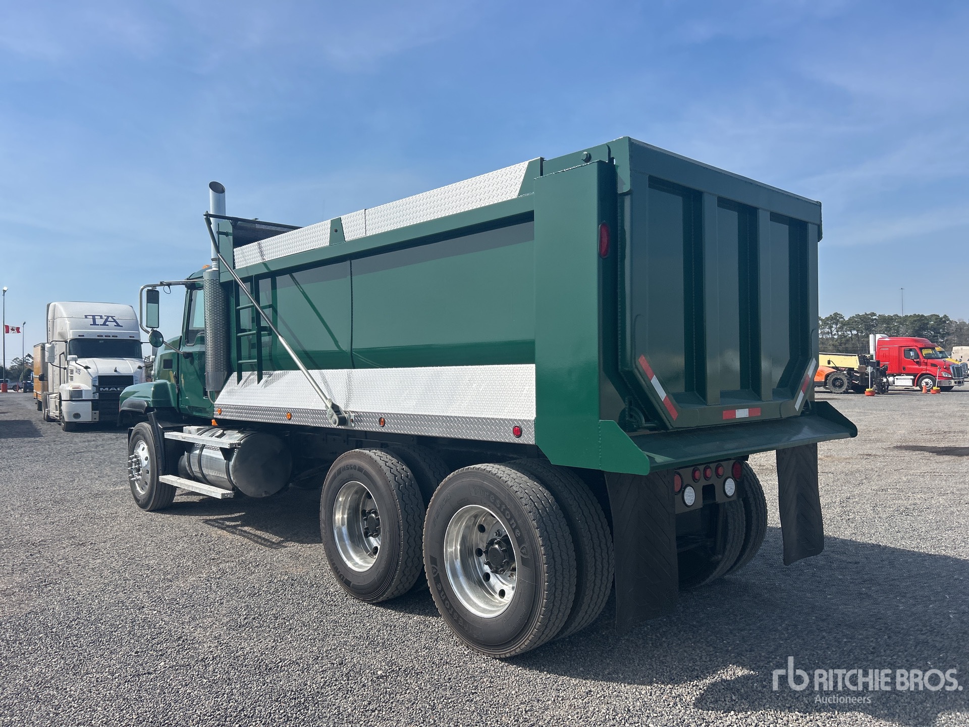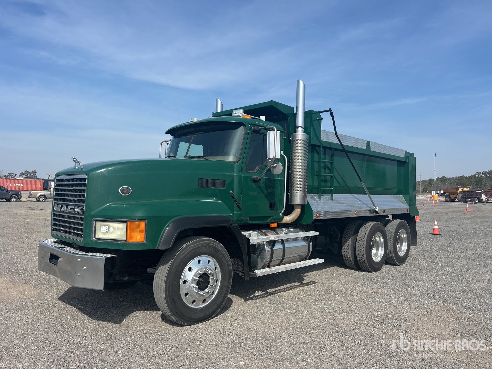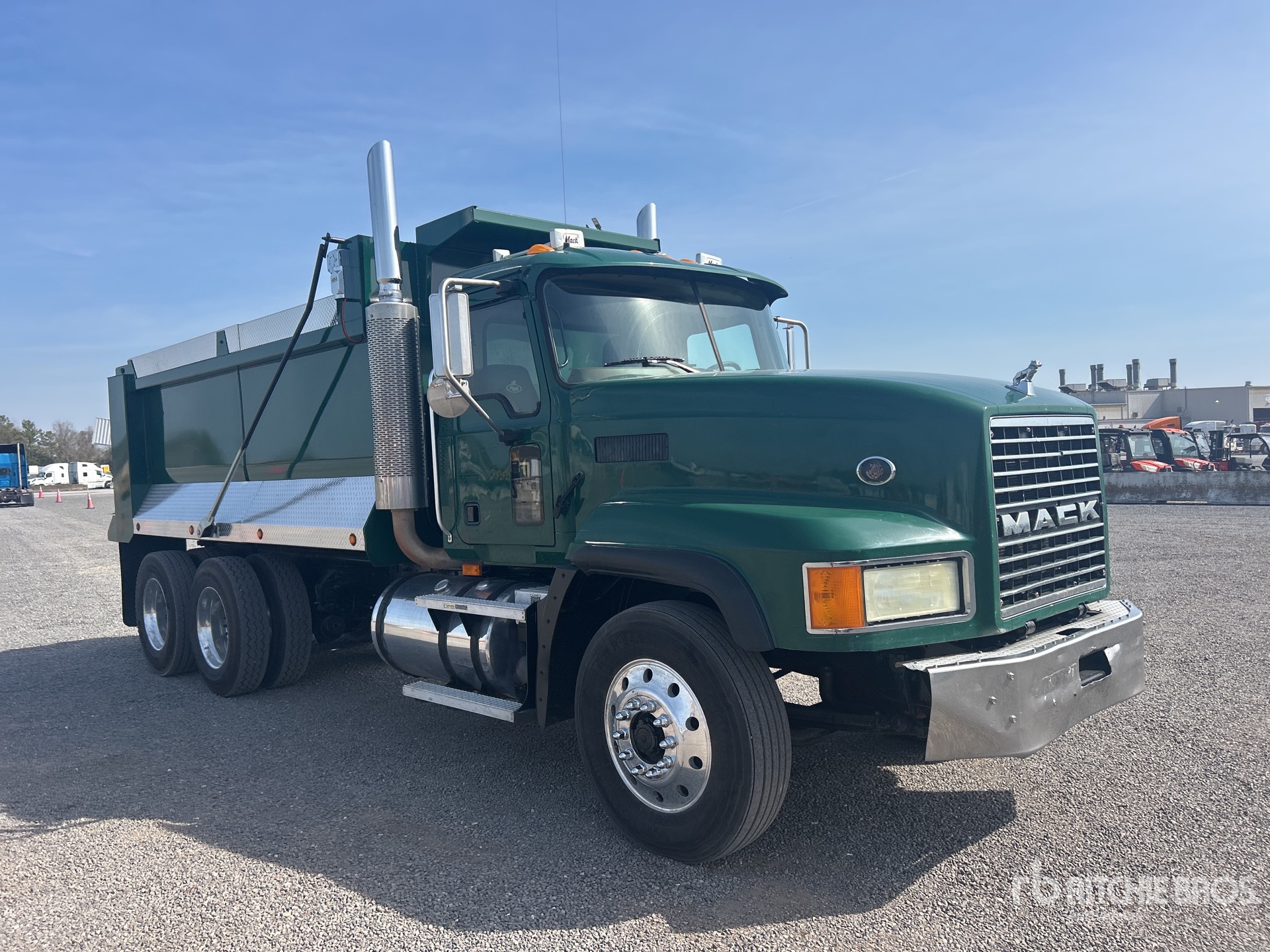 Cummins ISX 6 Cylinder 15.0 L Diesel 500 hp Engine, 2005 US EPA Label, 14599 Engine hrs, Engine Brake, Mack T318L 18-Speed Manual Transmission, 14320 lb Front Axle, 44000 lb Rears, 58320 lb GVWR, Air Ride Cab, Aluminum Wheels, 11R24.5, Air Ride Suspension, 217 in Wheelbase, 15 ft 6 in Long x 5 ft 2 in High Steel Body, Round Bottom, Electric Roll Tarp