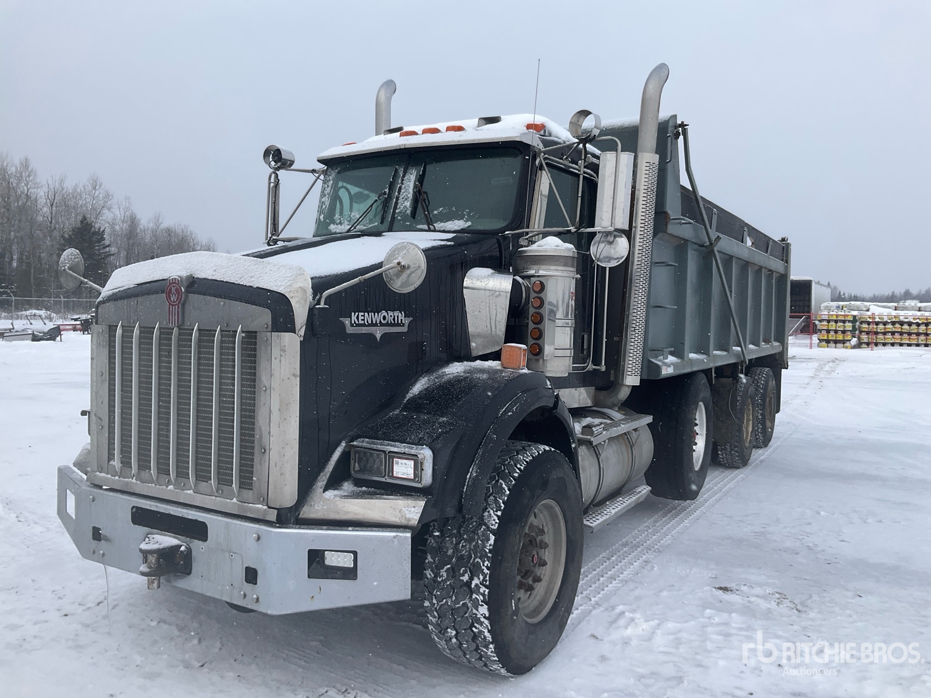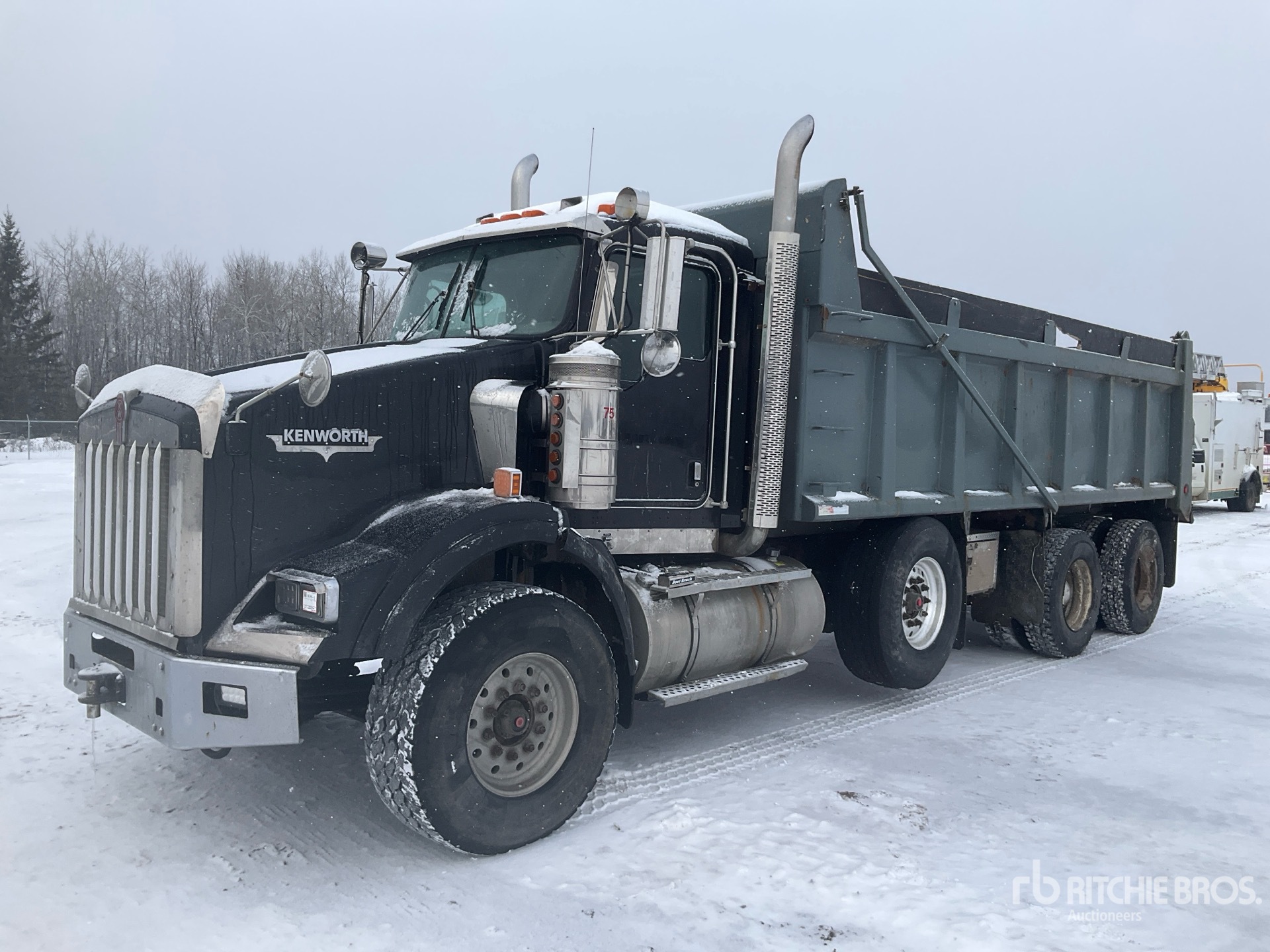 Cat C15 6 Cylinder Diesel 475 hp Engine, 24913 Engine hrs, Engine Brake, Eaton Fuller RTLO-18918B 18-Speed Manual Transmission, Differential Lock, 20000 lb Front Axle, 46000 lb Rears, 4.10:1 Axle Ratio, 86000 lb GVWR, Aluminum Front Wheels, 425/65R22.5 Front Tires, 11R22.5 Rear Tires, Steerable Air Lift Pusher Axle, Dual Steering Boxes, Double Frame, Chalmers Walking Beam Suspension, 260 in Wheelbase, PTO, Lagage 20 ft 6 in Long x 4 ft High Steel Body, Bed Vibrator, Air Powered Roll Tarp, Pintle Hitch