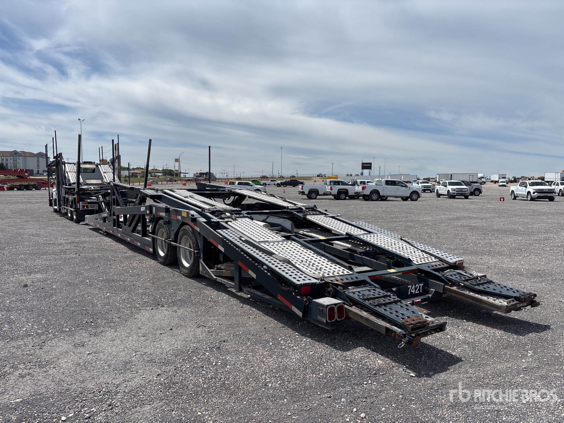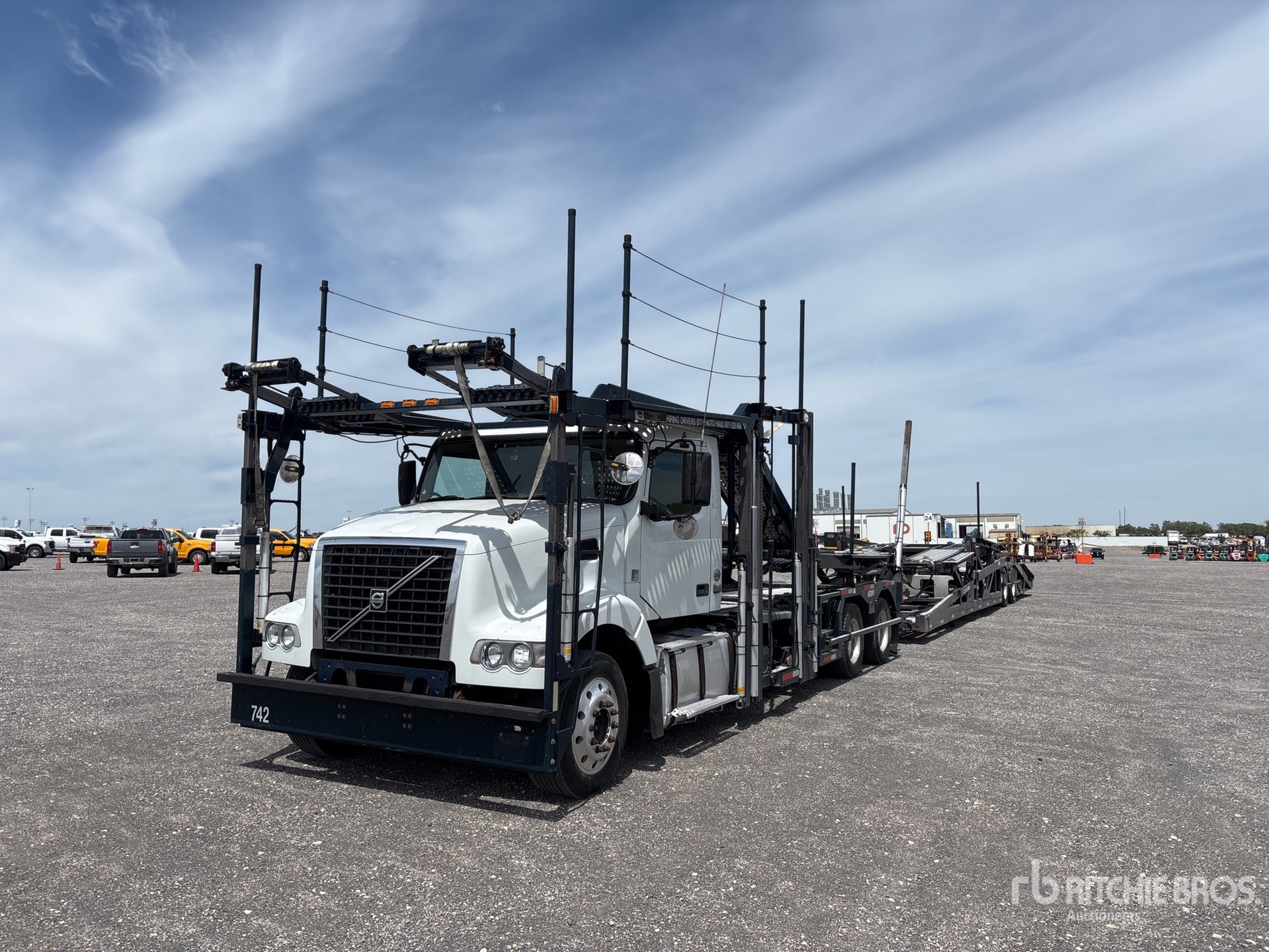 Volvo D11 10.8 L Diesel 405 hp Engine, 2013 US EPA Label, Eaton Fuller FRO-1421oc 10-Speed Manual Transmission, 14600 lb Front Axle, 38000 lb Rears, 52600 lb GVWR, Aluminum Wheels, 295/60R22.5 Front Tires, 265/70R19.5 Rear Tires, Air Ride Suspension, 244 in Wheelbase, 3 Vehicle Capacity, Soft Tie Downs, SOLD WITH - 2013 Cottrell T/A, Trailer S/N - 5EOAA1447EG508503, Soft Ties, Aluminum Wheels, 265/70R19.5 Tires, 45000 lb GVWR