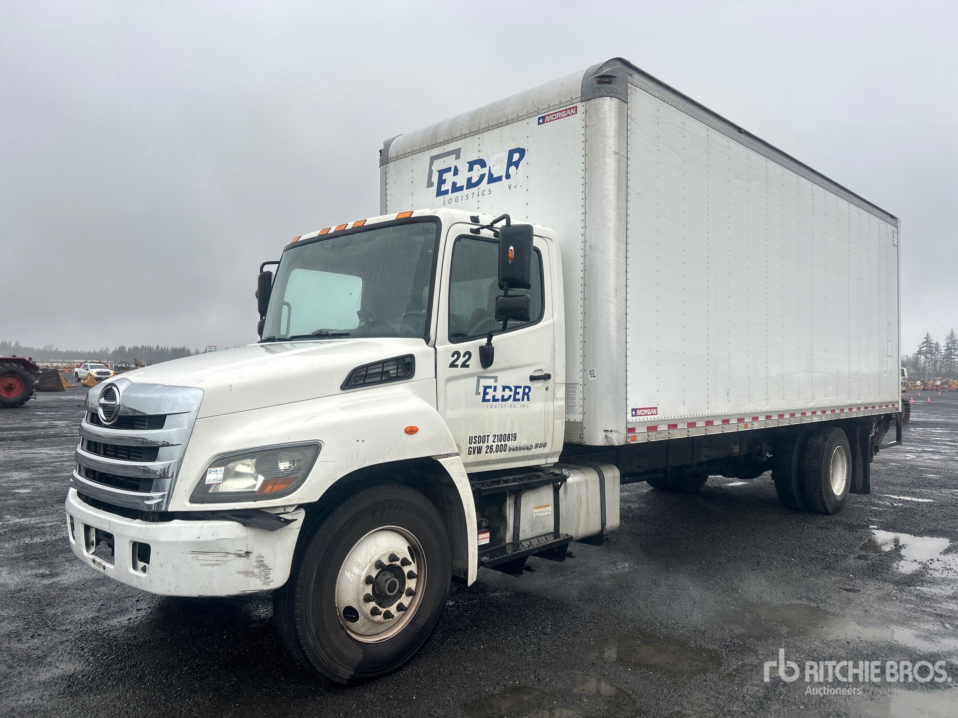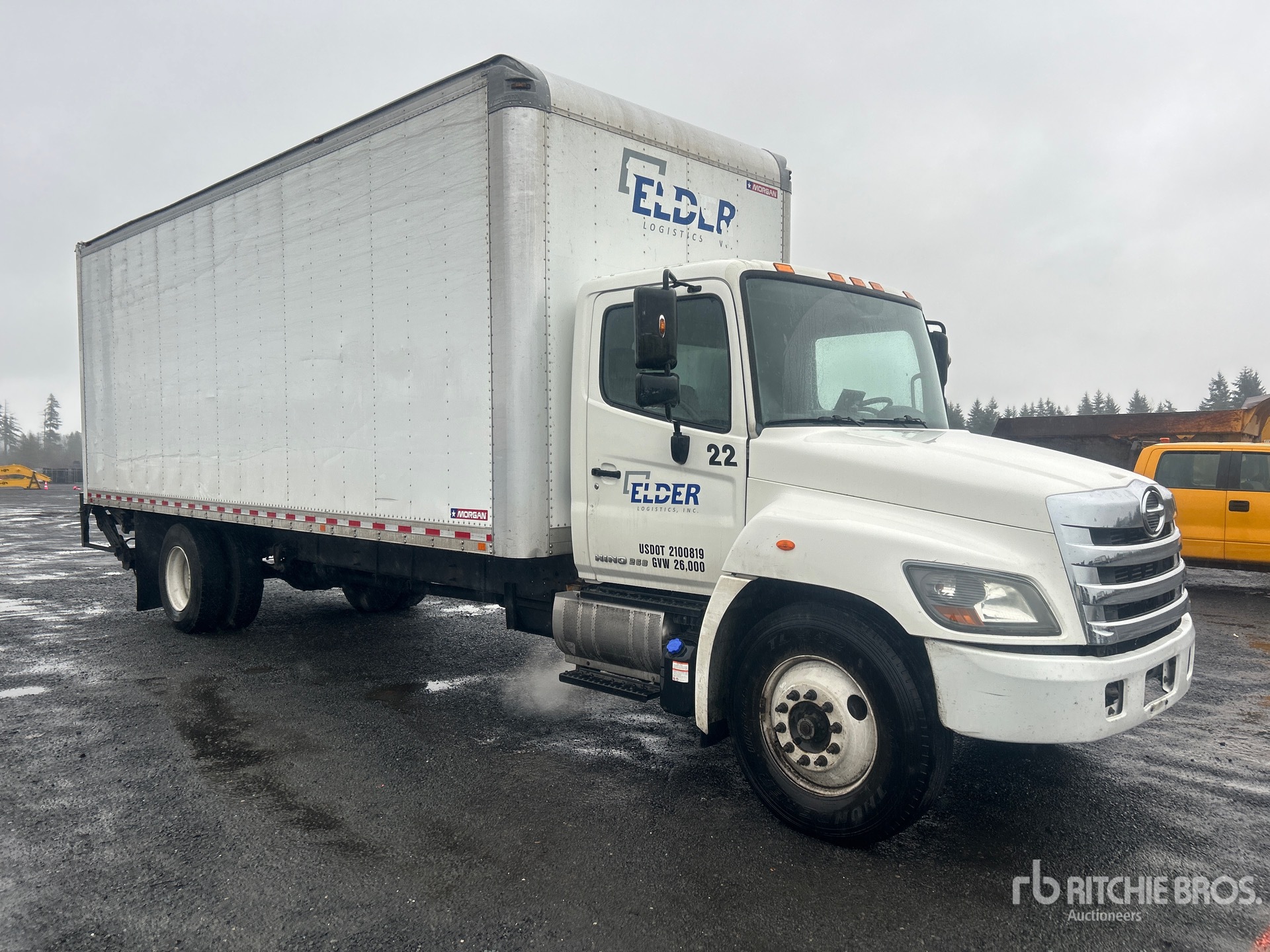 6 Cylinder Diesel Engine, Requires Diesel Exhaust Fluid, 999 Engine hrs, Automatic Transmission, 10000 lb Front Axle, 19000 lb Rears, 25950 lb GVWR, 11R22.5, Spring Suspension, 270 in Wheelbase, Morgan 26 ft x 102 in Wide x 103 in High Body, Liftgate
