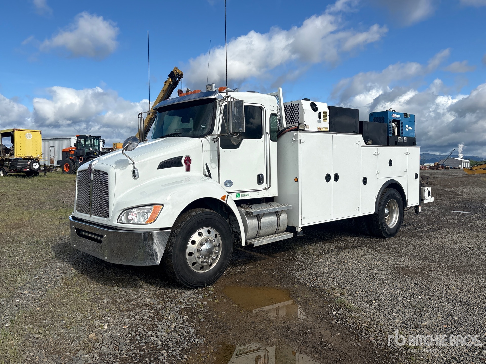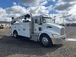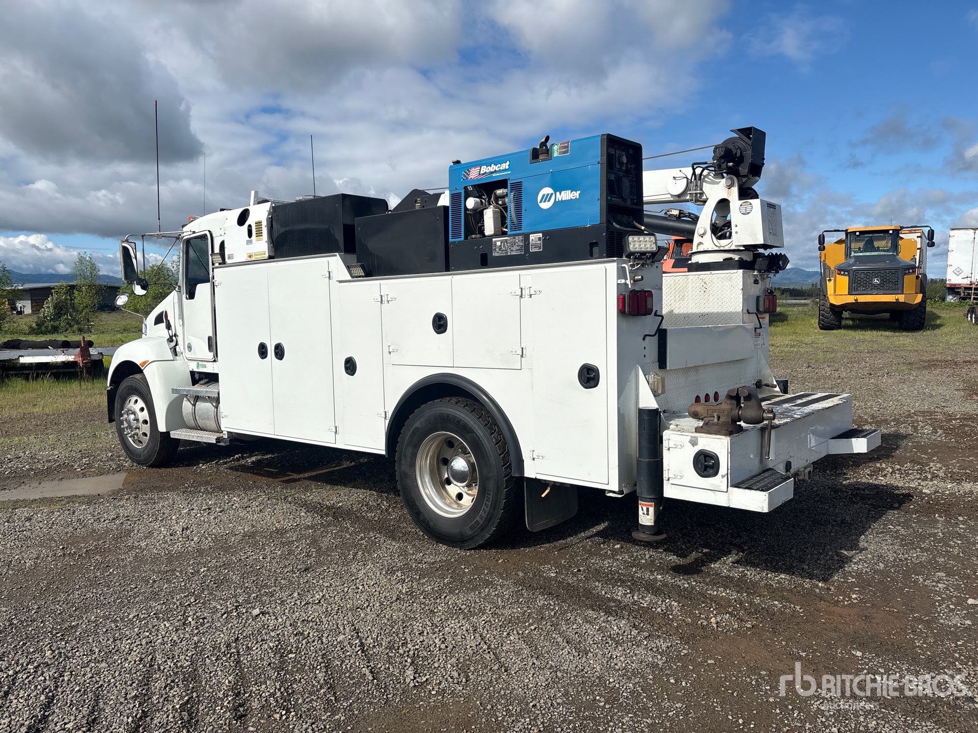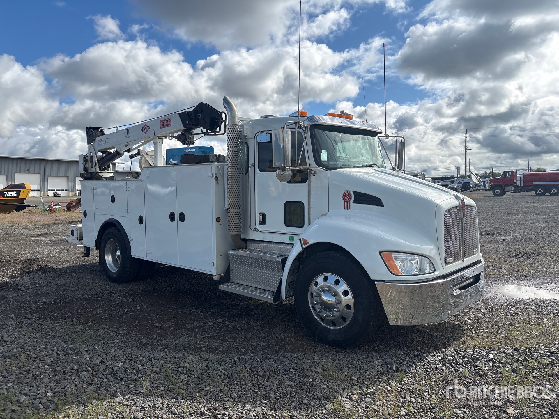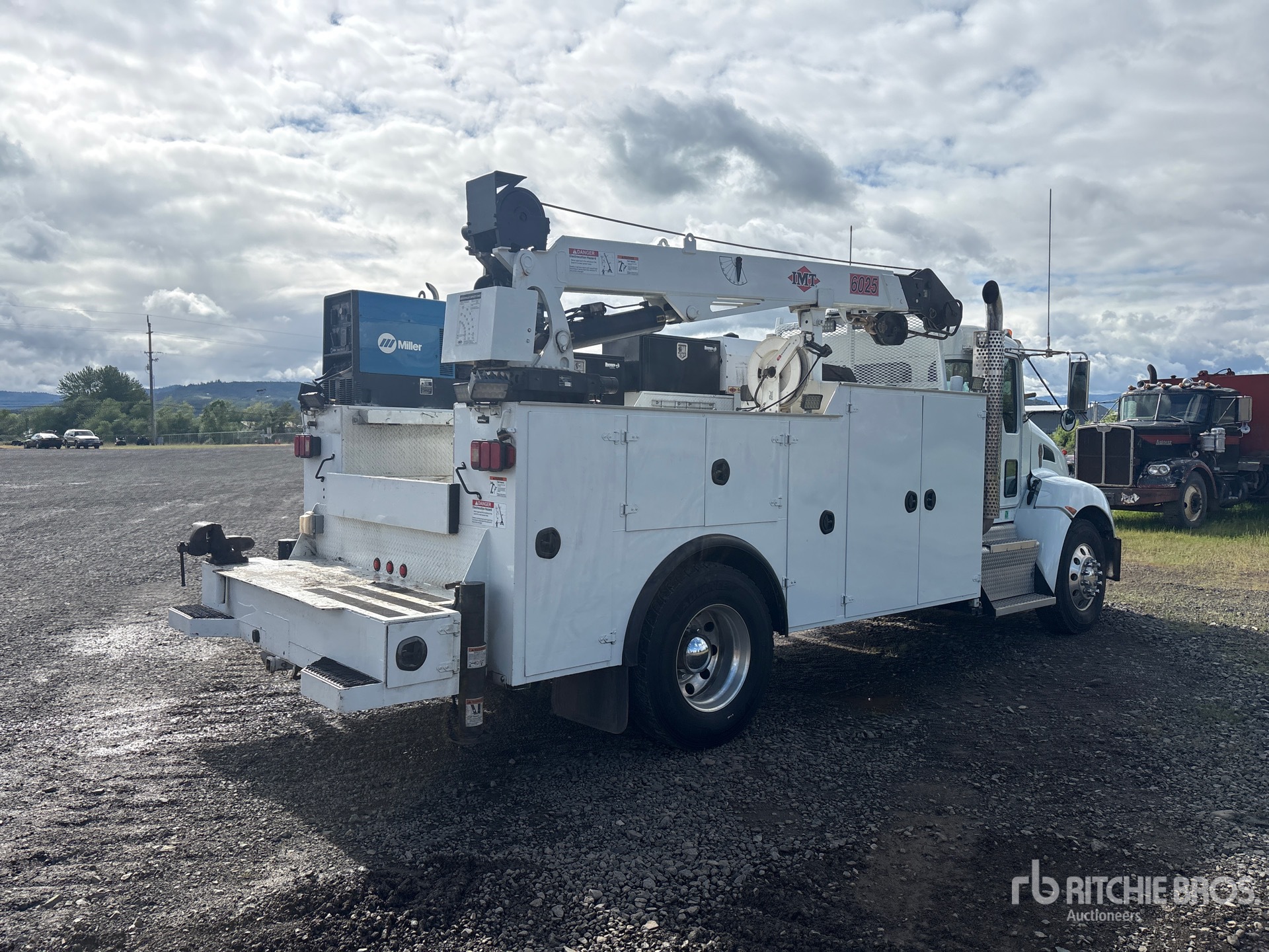 Paccar PX-9 6 Cylinder 8.9 L Diesel 300 hp Engine, 2014 US EPA Label, Requires Diesel Exhaust Fluid, Allison Automatic Transmission, 12000 lb Front Axle, 21000 lb Rears, 5.25:1 Axle Ratio, 33000 lb GVWR, Aluminum Wheels, 11R22.5, Spring Suspension, 145 in Wheelbase, PTO, 14 ft Body, Hydraulic Stabilizers, 2005 IMT 10000 lb 2 Section Hydraulic Crane, Wired Remote Control, Miller 10 kW Gasoline Generator Set, IMT PTO Air Compressor, Miller 10 kW 200 A Gasoline Welder