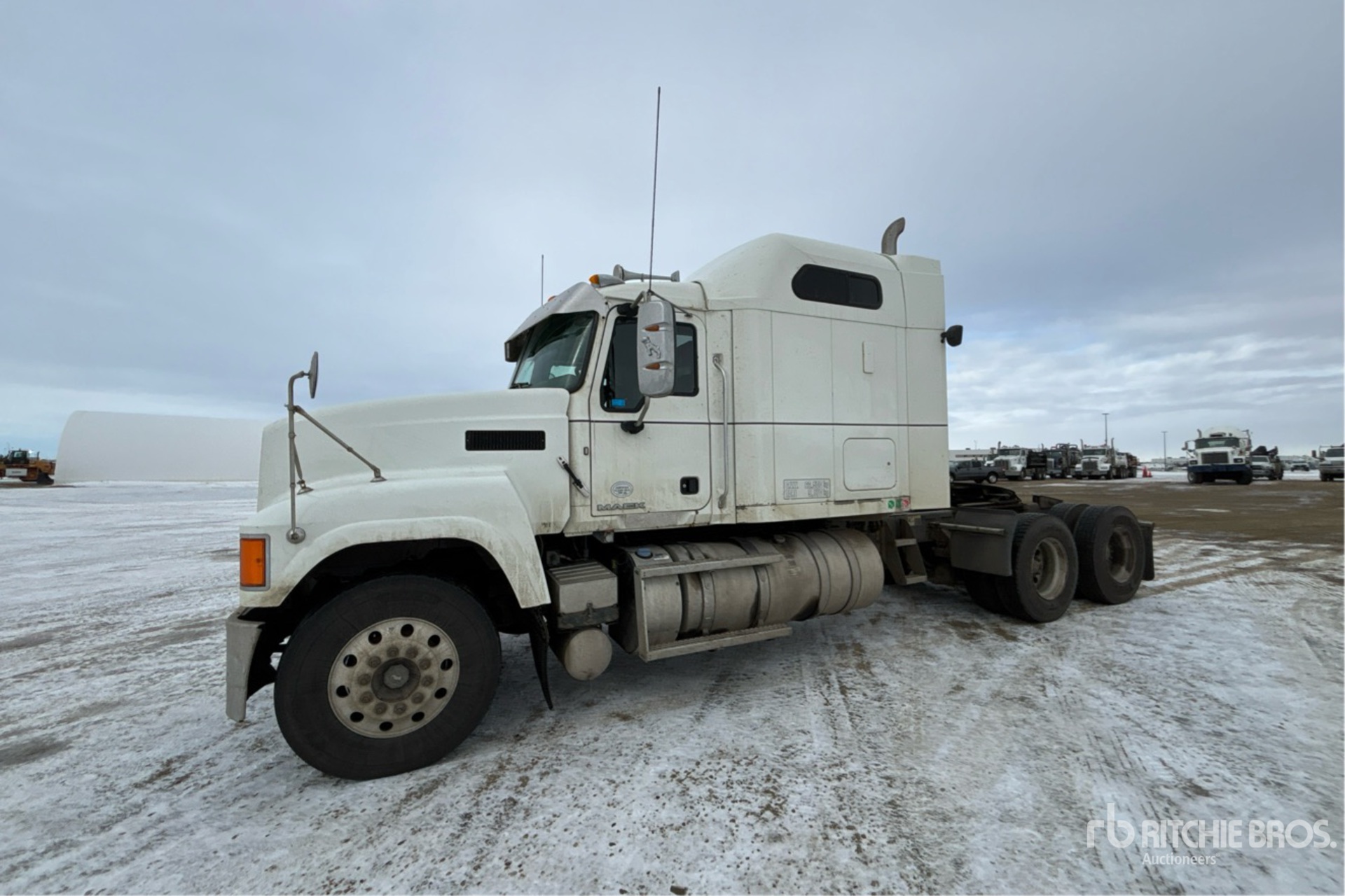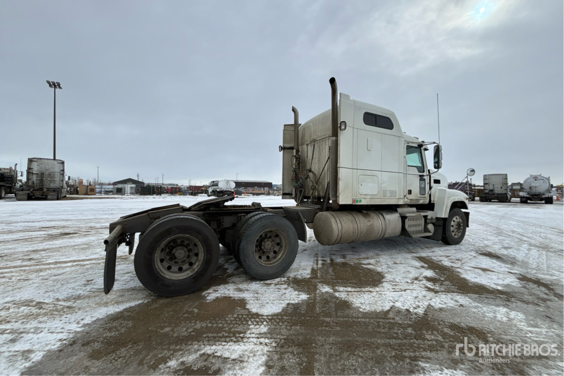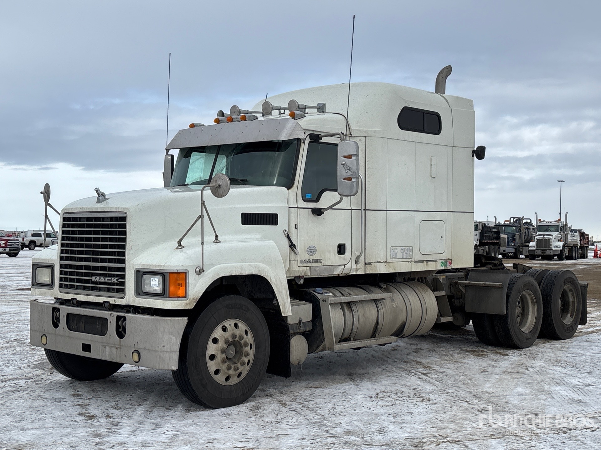 Located in Lane 33 Spot 10, Mack MP8 505 hp Engine, 2014 US EPA Label, 19869 Engine hrs, Eaton Fuller 18-Speed Manual Transmission, 14600 lb Front Axle, 46000 lb Rears, 60600 lb GVWR, Engine Brake, Differential Lock, 60 in Mid Roof Sleeper Cab, Bunk Heater, 242 in Wheelbase, Air Suspension, Aluminum Wheels, 11R22.5, Air Sliding 5th Wheel, Dual Fuel Tanks
