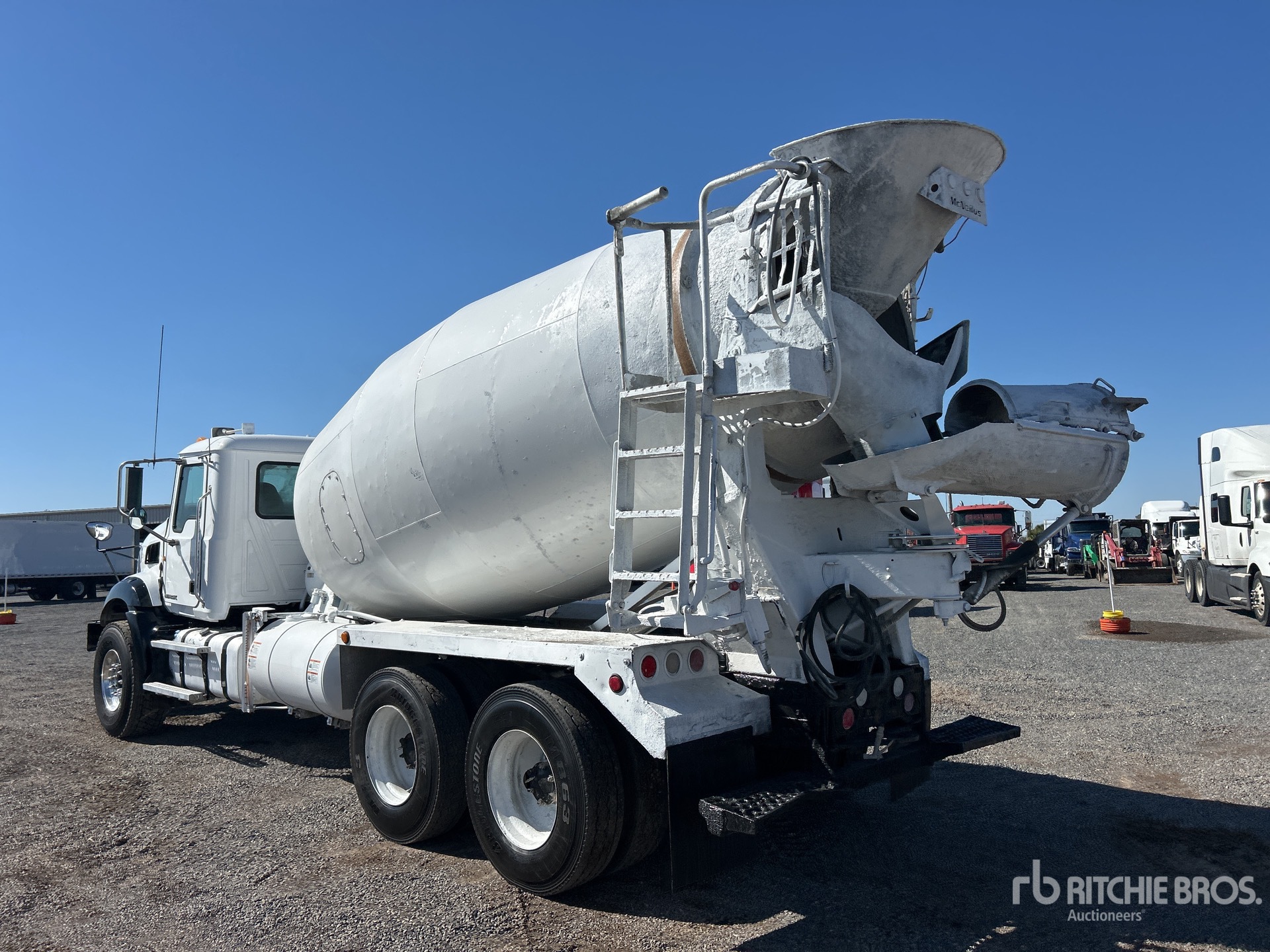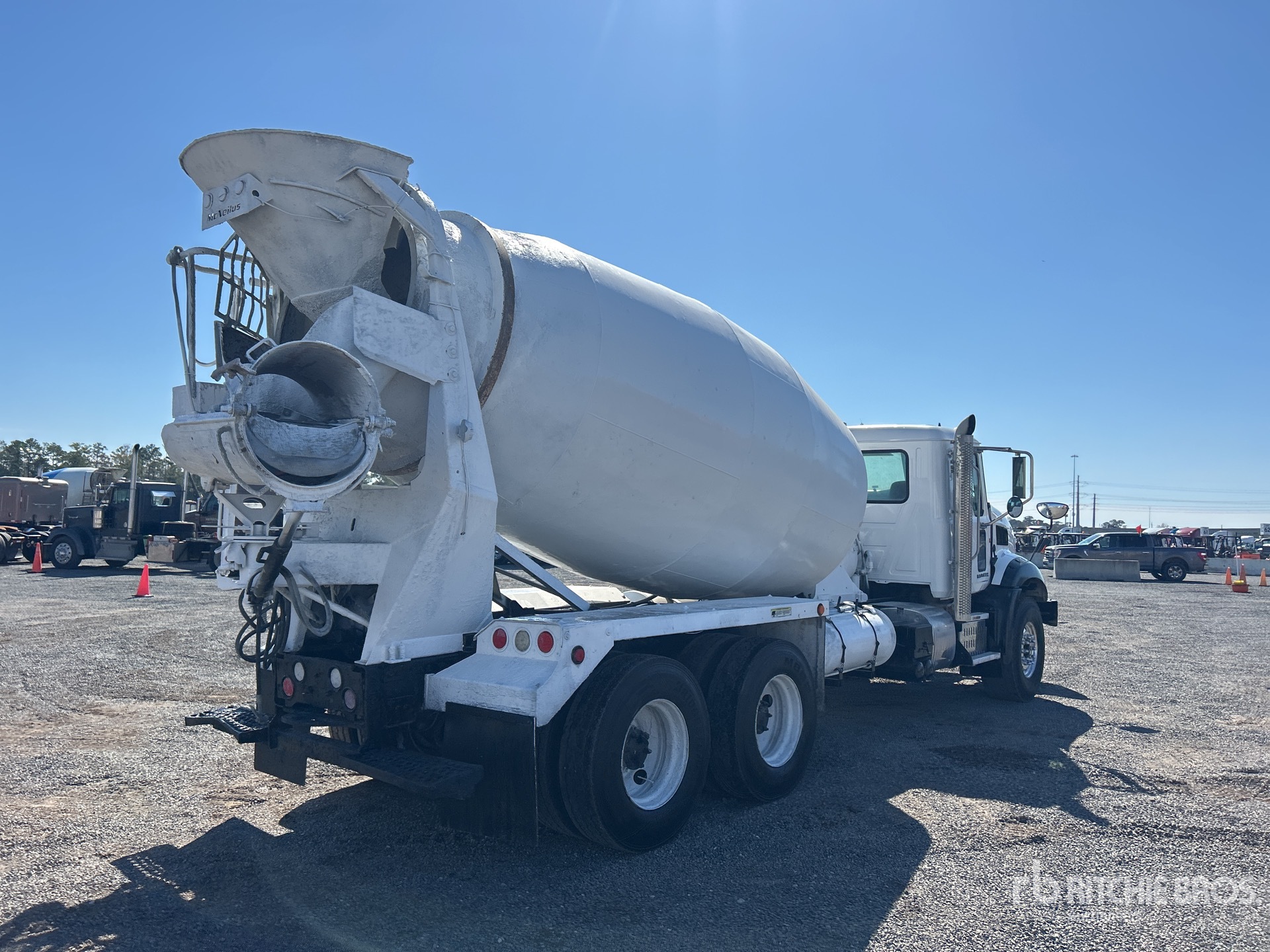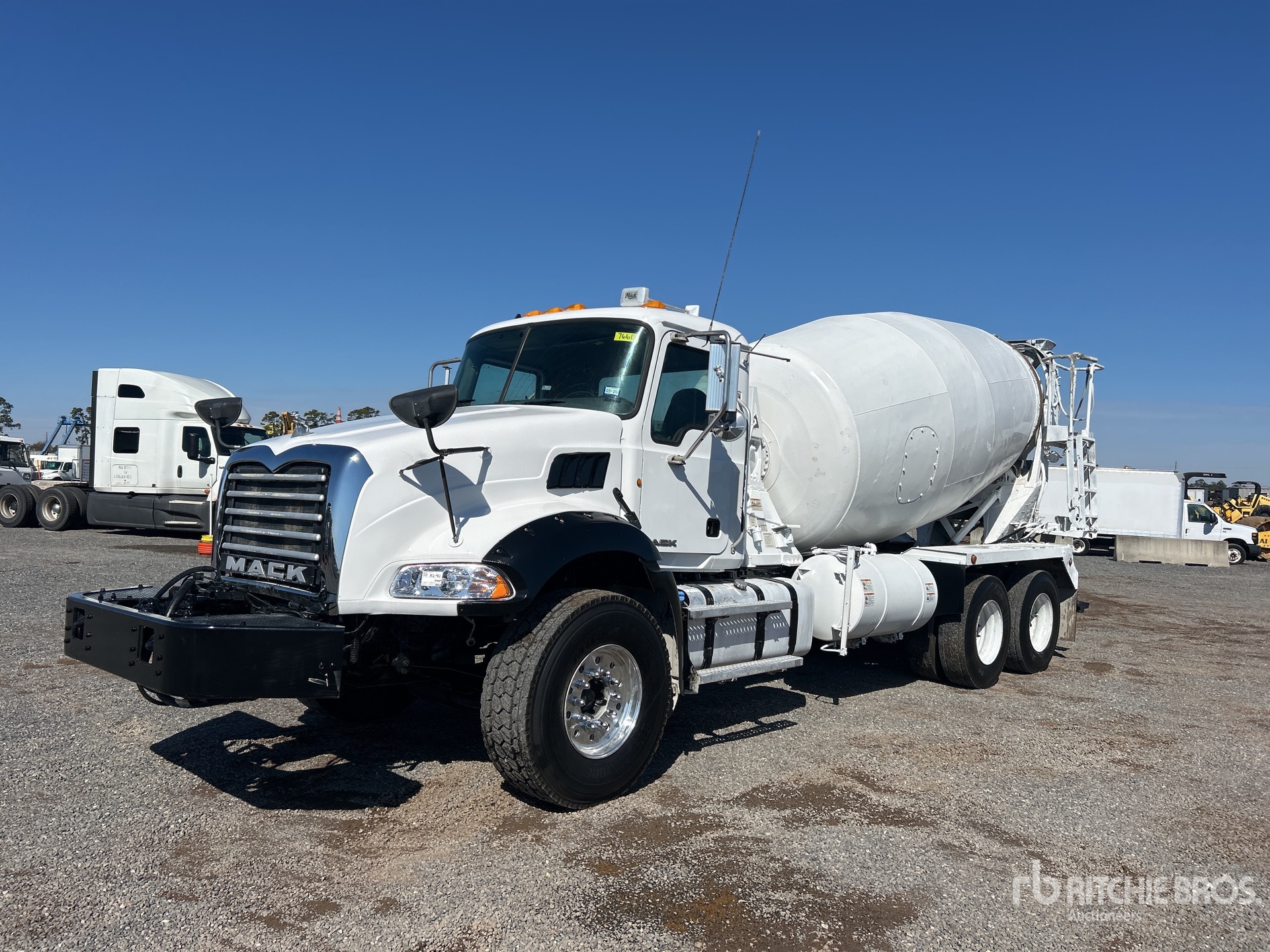 Located in Lane 33 Spot 18, Mack MP7 6 Cylinder Diesel 395 hp Engine, 2014 US EPA Label, Requires Diesel Exhaust Fluid, Engine Brake, Allison Automatic Transmission, 22800 lb Front Axle, 46000 lb Rears, 68800 lb GVWR, Air Ride Cab, Aluminum Front Wheels, 425/65R22.5 Front Tires, 11R22.5 Rear Tires, Dual Steering Boxes, Camelback Spring Suspension, 225 in Wheelbase, McNeilus Mixer Unit, 3 Removable Chutes