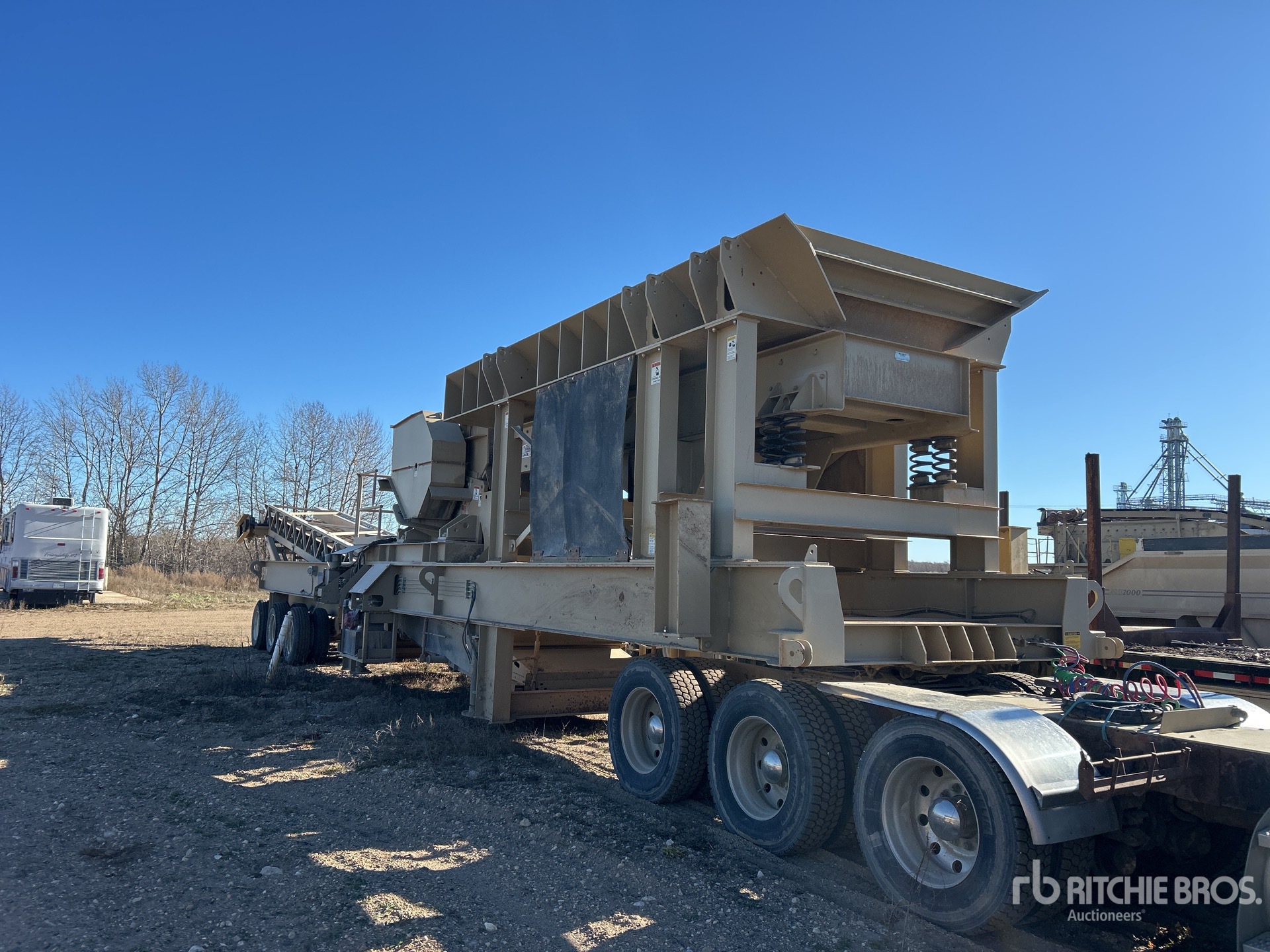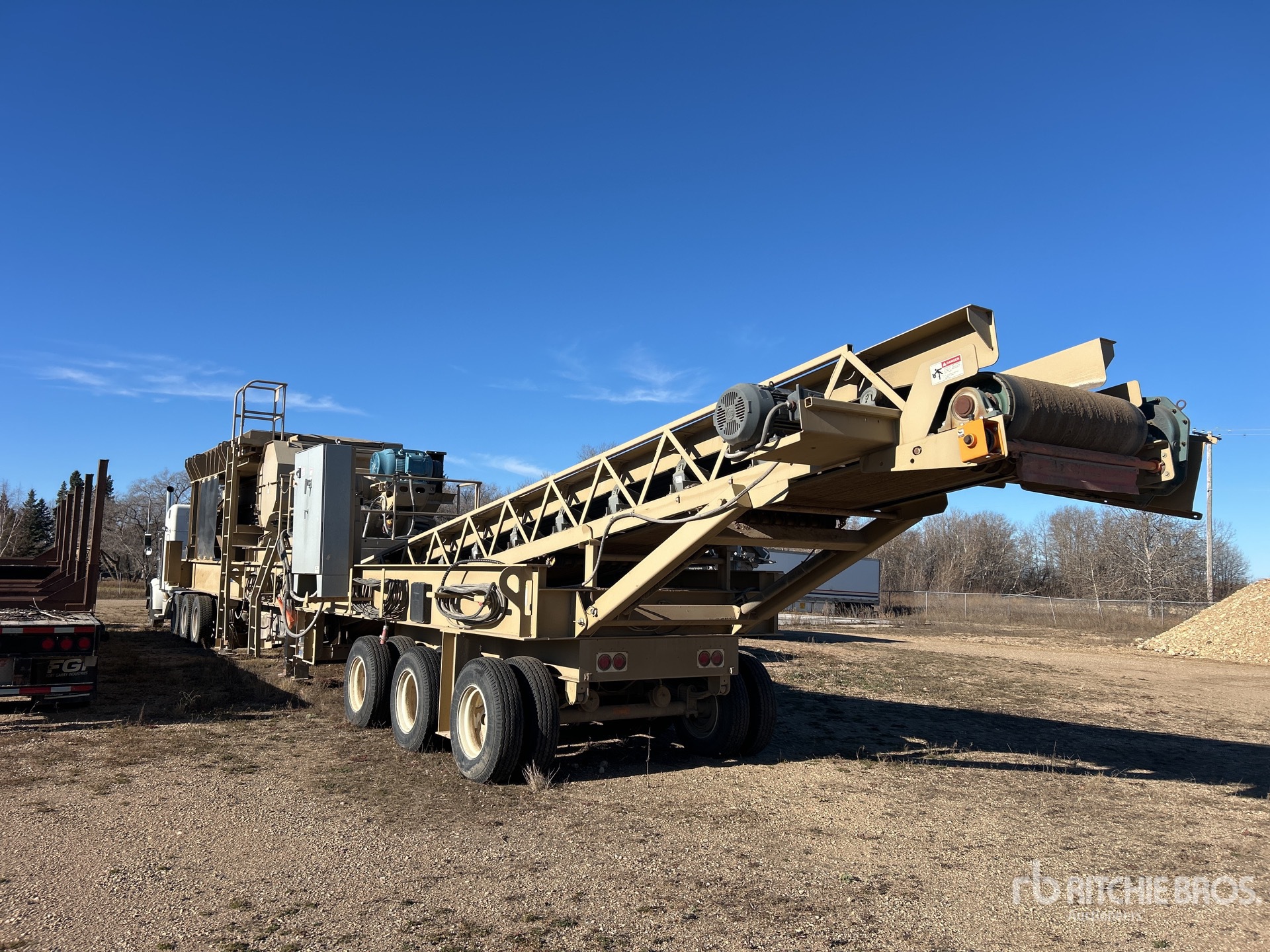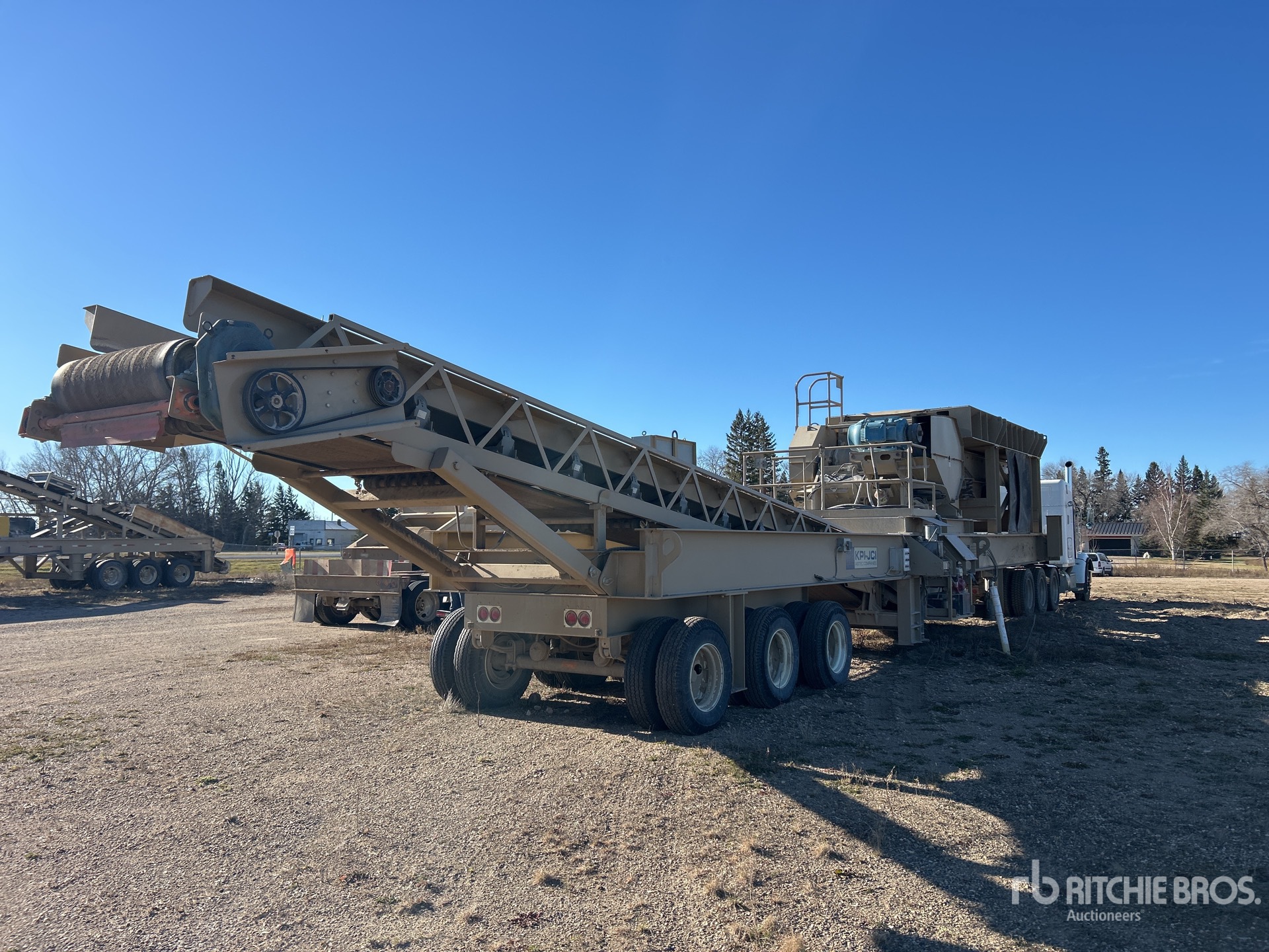 Fabtec 9 ft x 19 ft Vibratory Pan Feeder KPI JCI 20 in x 56 in Jaw Crusher, 125 hp Drive Motor, 48 in Wide Under Crusher Conveyor, Radio and Cable Remote Control, Auto Lube, Honda GX240 1 Cylinder Gasoline Engine, Tri/A Carrier, Hydraulic Leveling