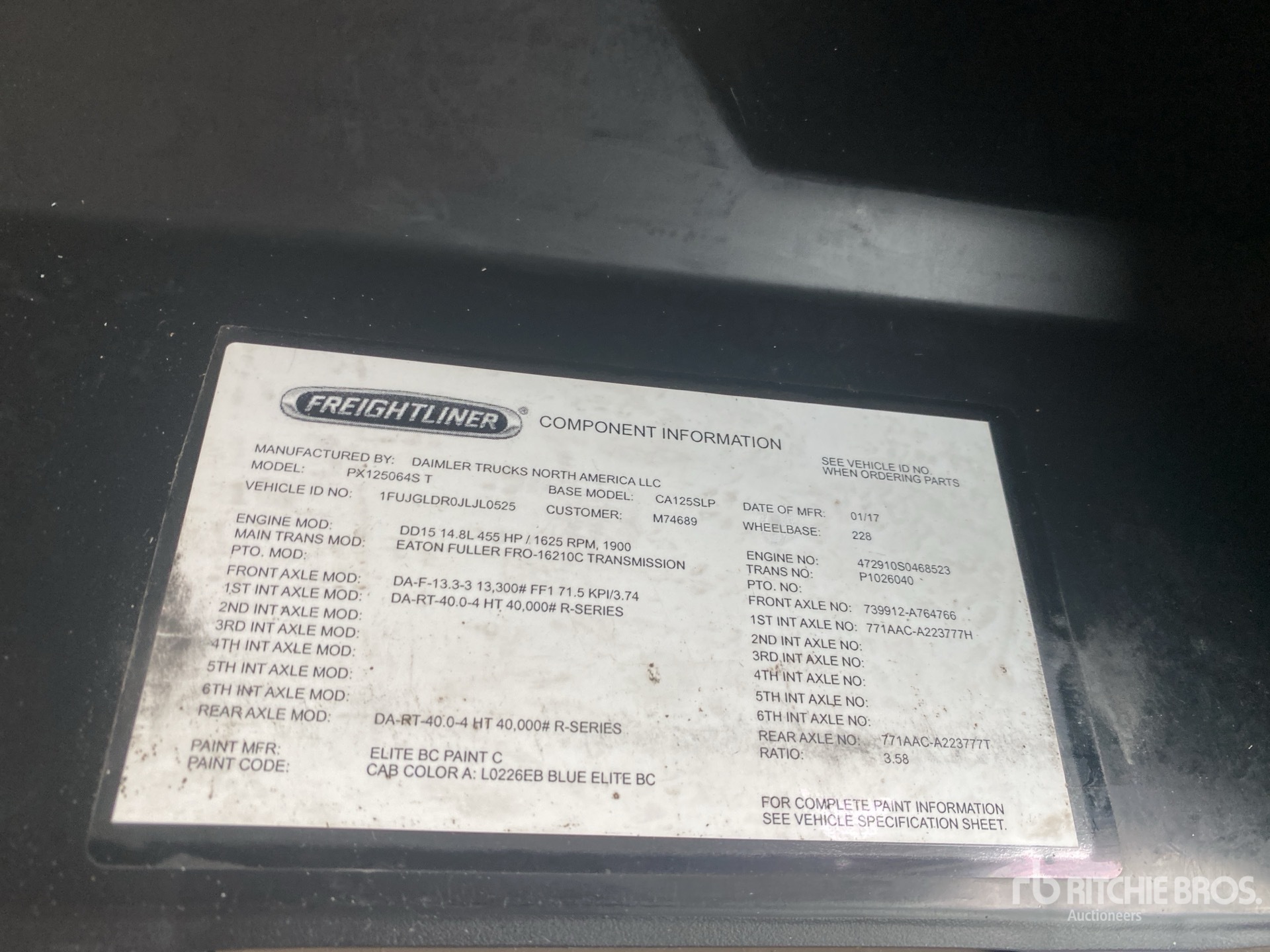 Detroit DD15 455 hp Engine, Eaton Fuller FRO-16210C 10-Speed Manual Transmission, 13220 lb Front Axle, 40000 lb Rears, 53220 lb GVWR, Engine Brake, 60 in High Rise Sleeper Cab, Bunk Beds, 228 in Wheelbase, Air Suspension, 11R22.5, Air Sliding 5th Wheel, Dual Fuel Tanks