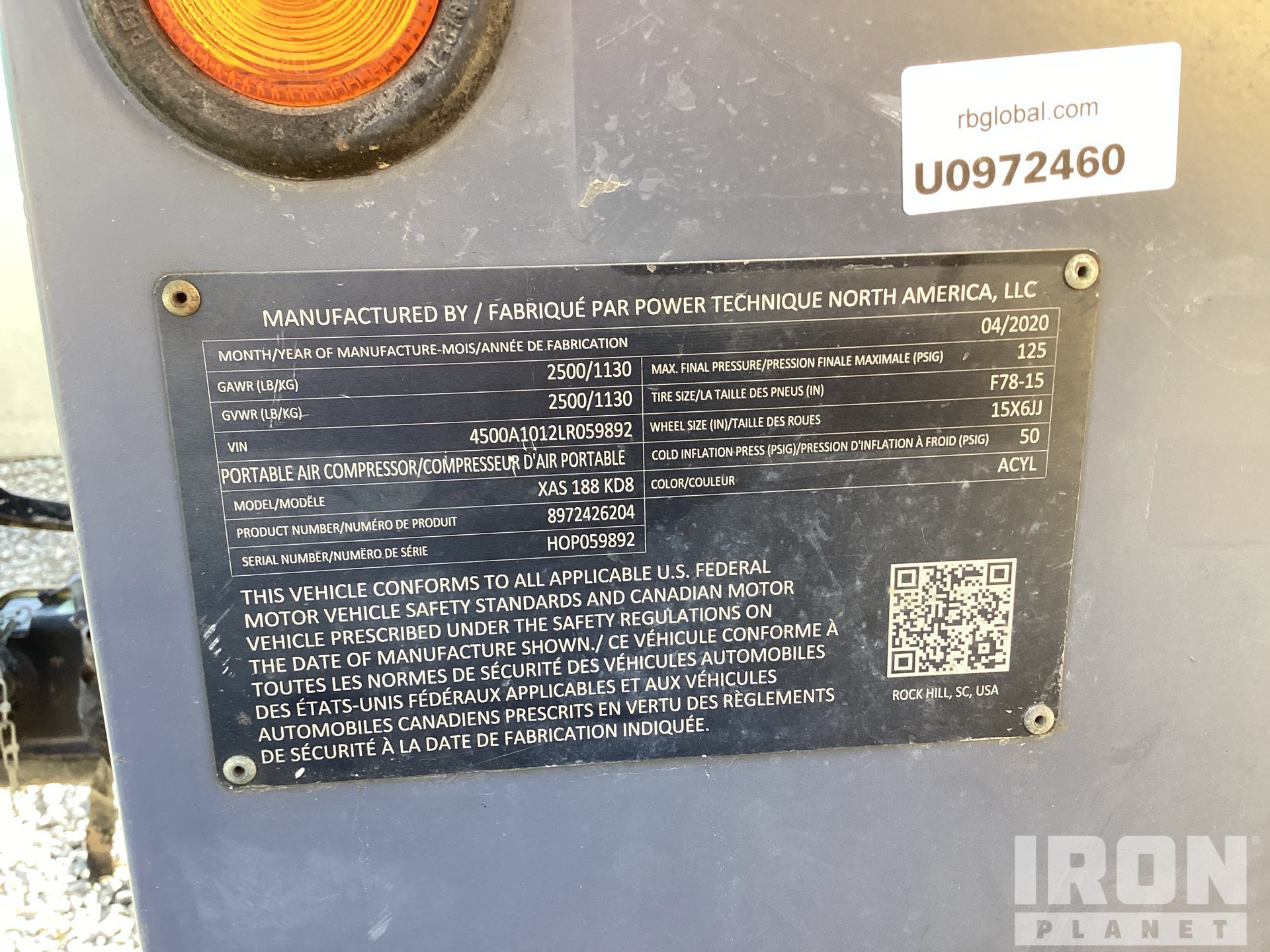 125 psi Working Pressure, 2020 US EPA Label, Kubota D1803 3 Cylinder 1.8 L Diesel Engine, Lunette Ring Carrier Trailer