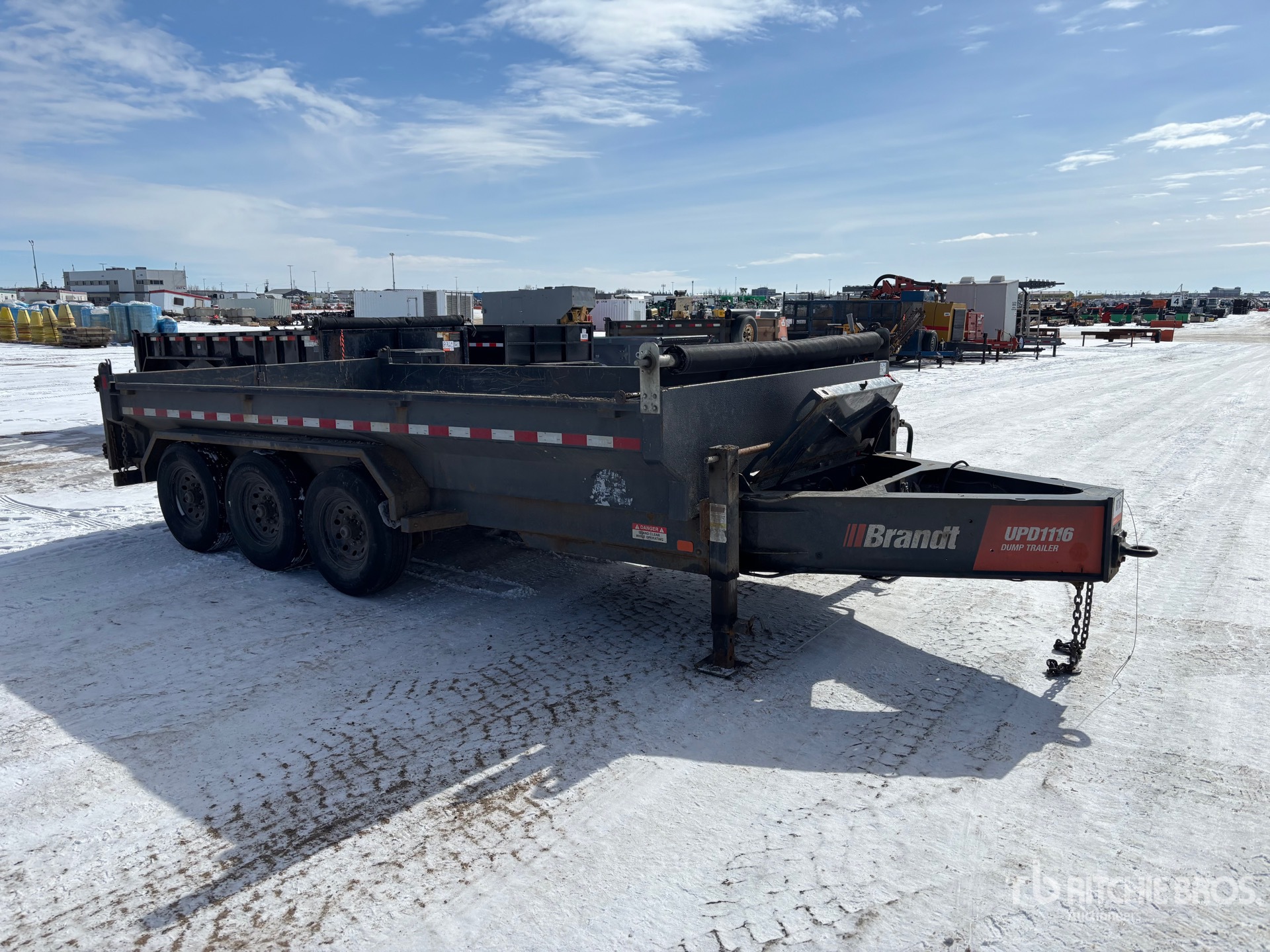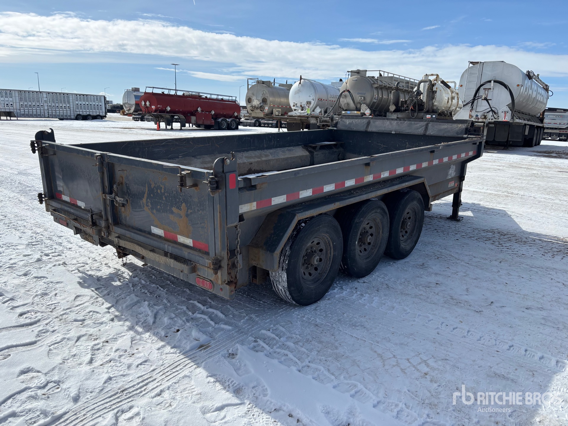 Located in Lane 4 Spot 107, Lunette Ring Hitch, Spring Suspension, Electric Brakes, 16 ft Body, Steel Body, Manual Roll Tarp, Split Swing Tailgate, 235/80R16 Tires, 9980 kg GVWR