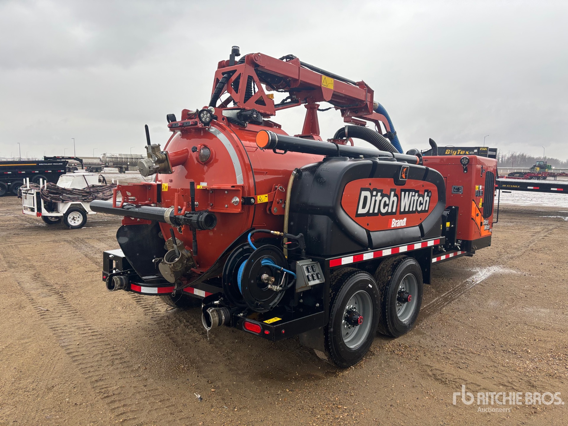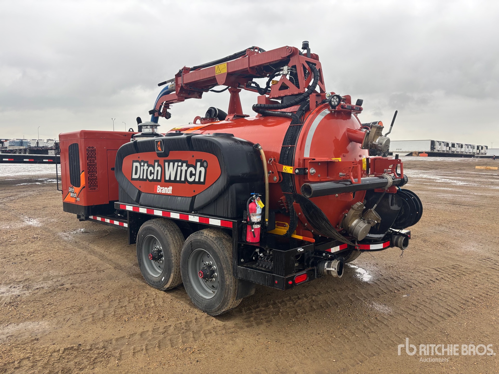 Lunette Ring Hitch, Torsion Axle, Electric Brakes, Steel Debris Tank, Rear Hose Reel, Fresh Water Tank, Wash Down System, Boom, Engine Driven Pump, Blower, Boiler, Water Heater, Cordless Remote Control, 235/75R17.5 Tires, 24000 lb GVWR, Diesel Engine