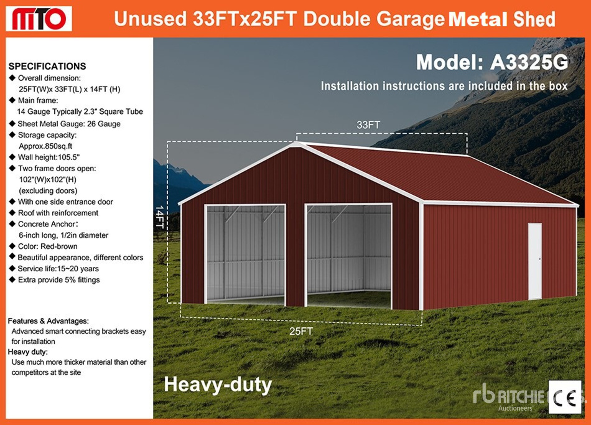 2026 MTO A3325G 25 ft x 33 ft Double Garage Metal Storage Building (Unused)