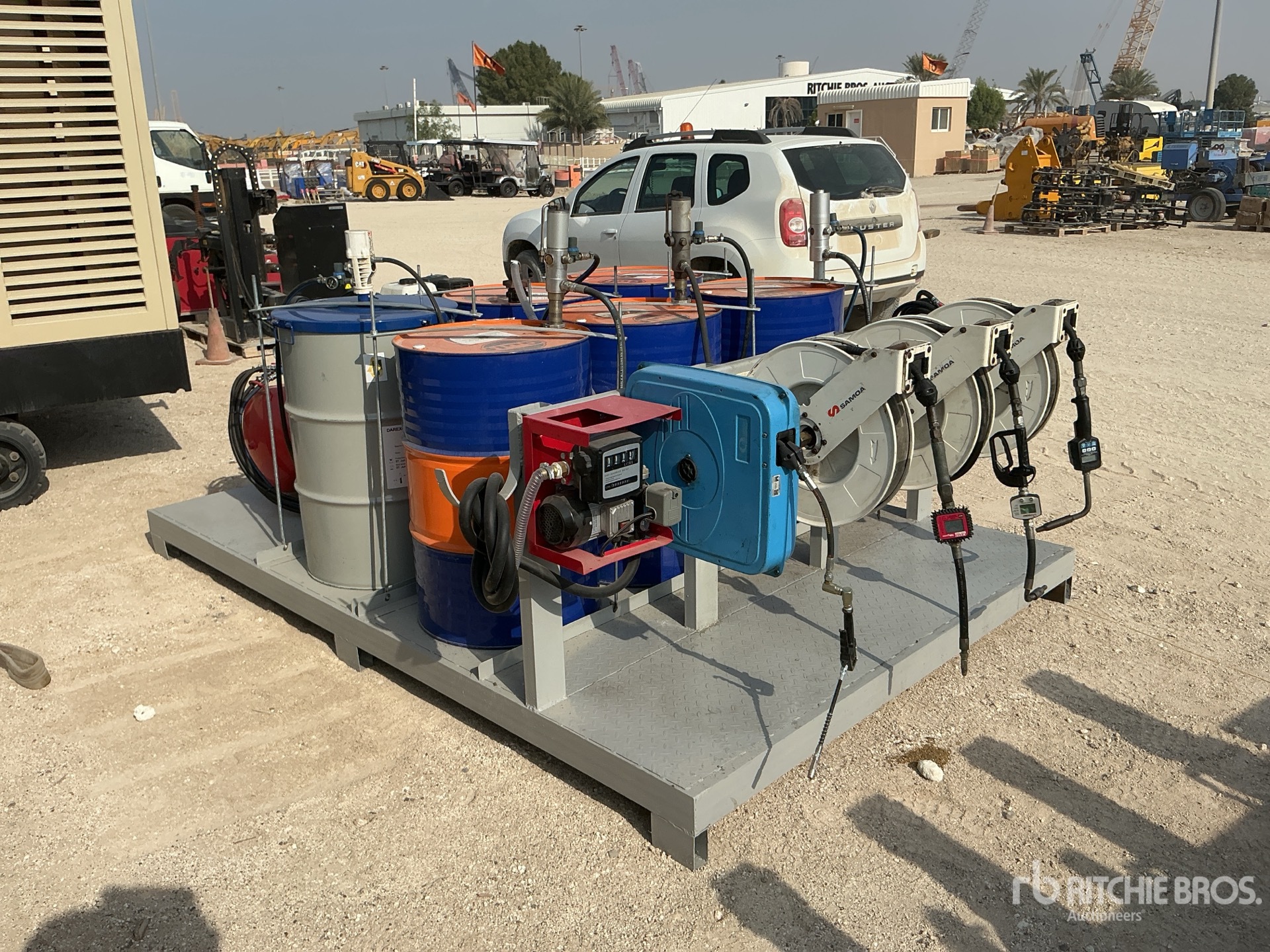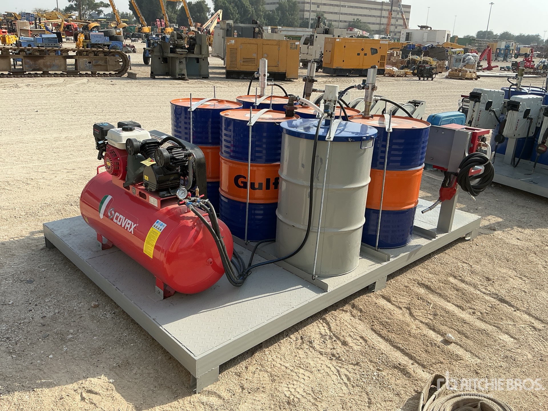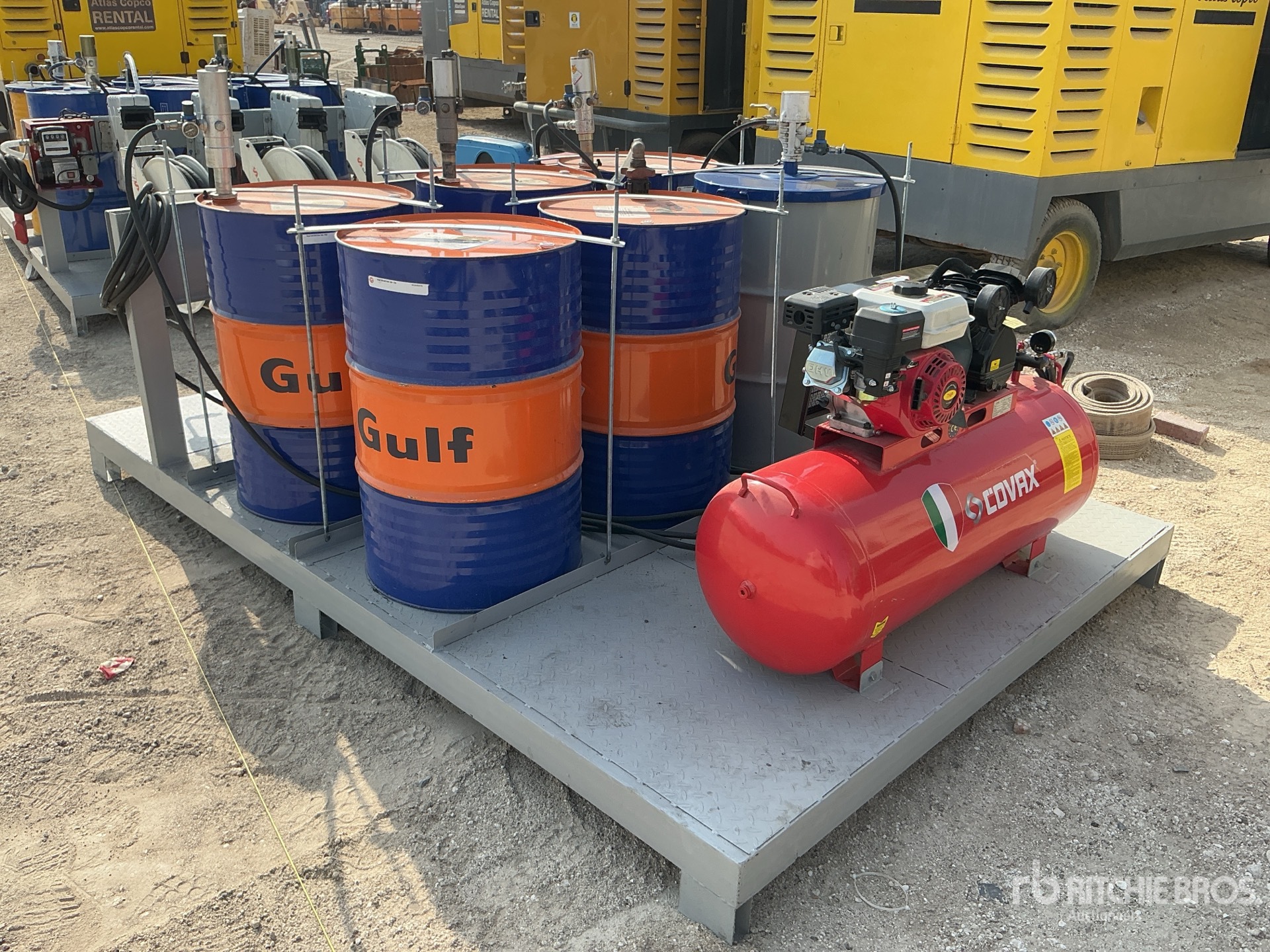 200 lit Shop Air Compressor with 1 cyl petrol engine, pumps, product barrels, hose reels