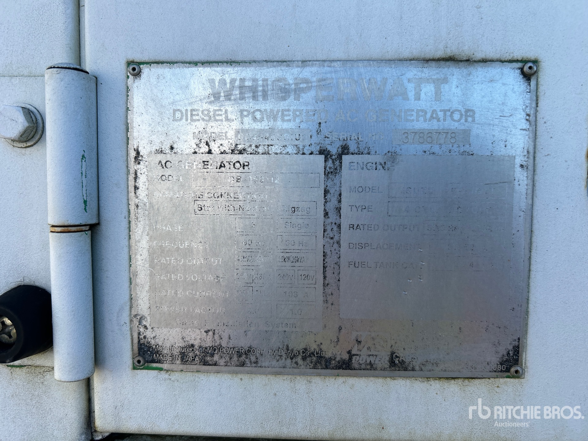 Isuzu 86-4jg1t 4 Cylinder 55.3 hp 3.059 L Diesel Engine, 45 kVA/36 kW Rated 3 Phase Output, 480 V / 240 V / 120 V Rated Voltage, 26 kVA,/26 kW, Rated Single Phase Output, 240 V / 120 V Rated Voltage, 240 V & 120 V Receptacles, Sound Attenuated