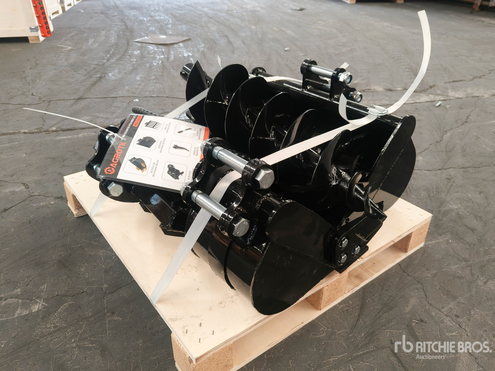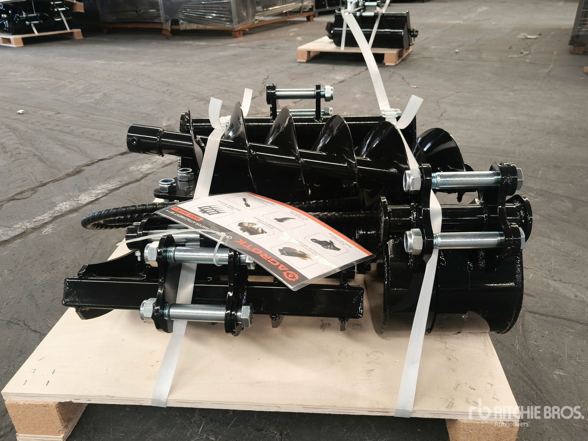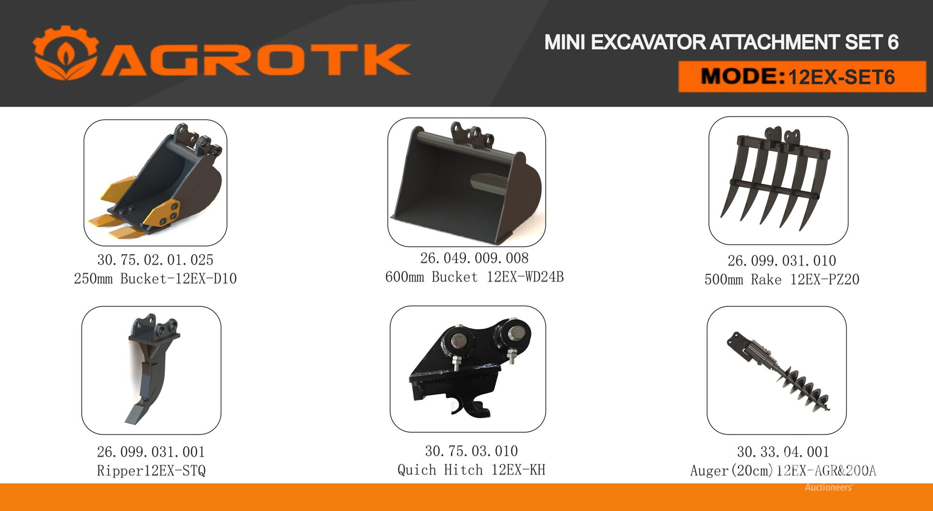 (1) 10 in Digging Bucket, (1) 24 in Cleanup Bucket, (1) Quick Coupler, (1) Ripper, (1) Rake, (1) Auger w/ 8 in Bit